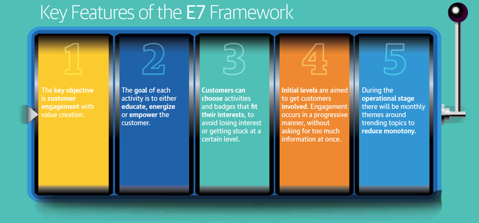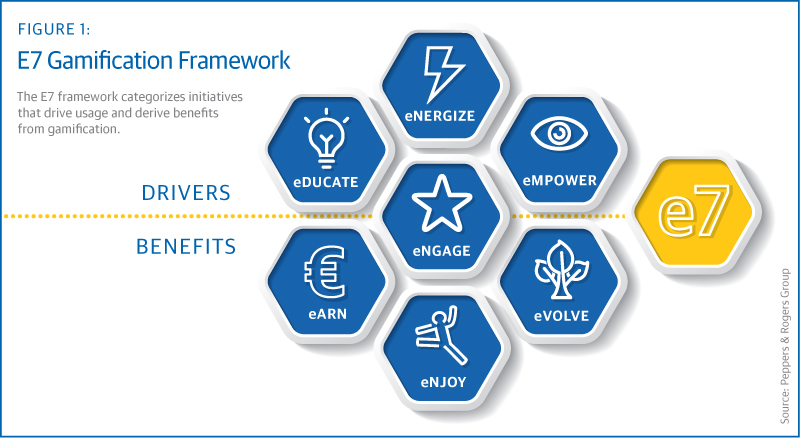 Peppers & Rogers Group has created a proprietary methodology called the “E7 framework” as a holistic approach to both drive usage and derive benefits from gamification. Simply stated: