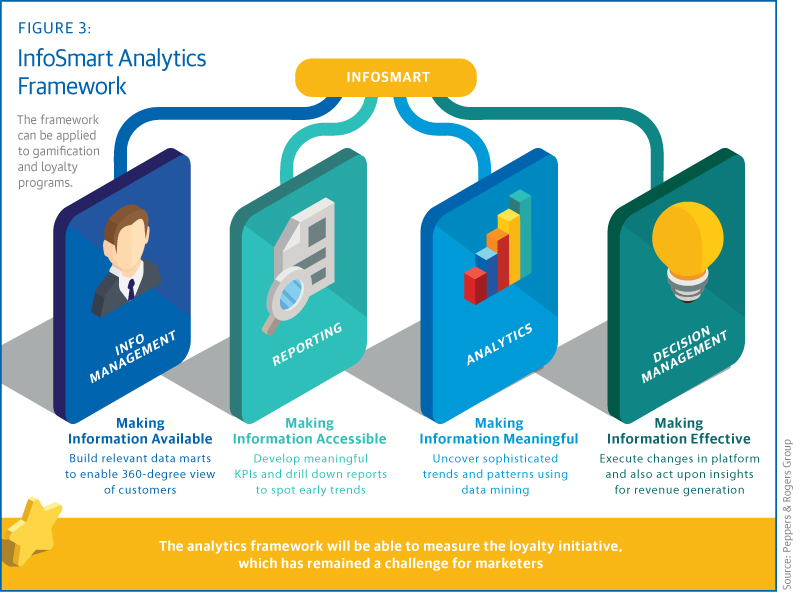 Though each program is unique, there are a few high-level recommendations for success. First, data analytics is critical to a successful program. Organizations must have centralized, shared data systems and processes in place to effectively monitor and report on the loyalty program. The Peppers & Rogers Group’s InfoSmart analytics framework consists of information management, reporting, analytics, and decision management to enable an effective data environment (see Figure 3).
