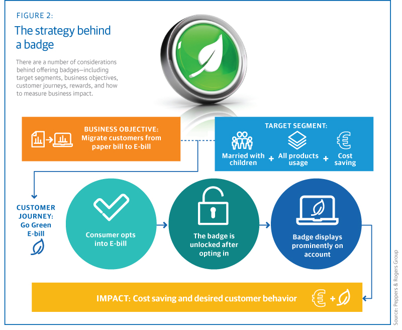 Here is where strategy becomes paramount. Badges must be created based on a number of factors, including which customer segments to reach, what business objectives to achieve, and how achieving the badges impacts the business. Otherwise, it’s a program without tangible results. Figure 2 illustrates the considerations and processes related to a hypothetical “Go Green” badge.