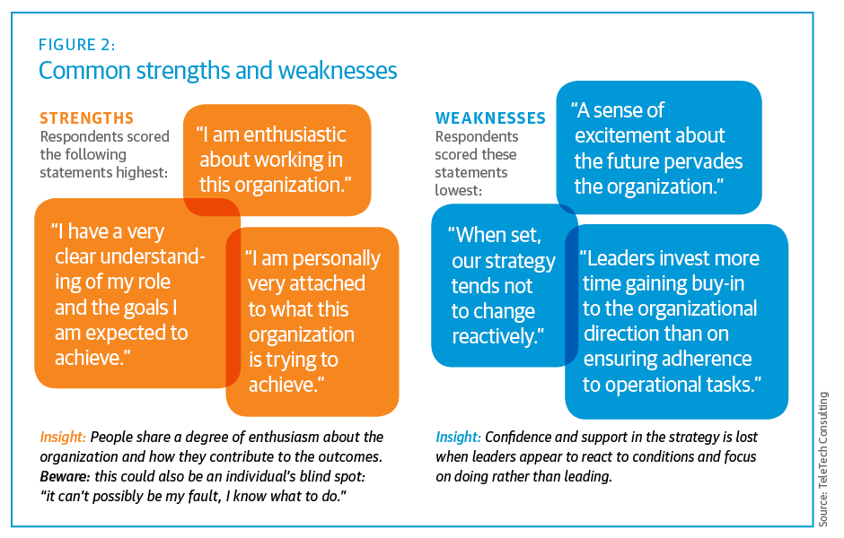 Insight: These point to poor performance by leaders in the “communication” domain, and reinforces the finding that leaders aren’t able to build belief and excitement in the vision and strategy as conditions change.