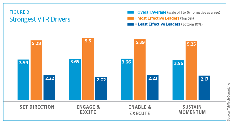 However, a different picture emerges when you slice the results into leaders and laggards. Engage & Excite is the strongest element for leaders ranked in the top 5 percent in terms of effectiveness, followed by nable & Execute, Set Direction, and Sustain Momentum. Meanwhile, Engage & Excite is the lowest scoring VTR area for those at the bottom 10 percent of results, or the least effective leaders. They ranked Execute and Set Direction (tie) as their strongest elements.