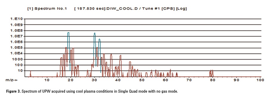 Figure 3 shows the spectrum obtained for UPW using cool plasma conditions in Single Quad mode with no cell gas. As can be seen, Ar+ (m/z 40) is suppressed under the lower temperature plasma conditions, but two intense background peaks are observed at m/z = 19 and 30. These are (H2O)H+ and NO+ respectively. In Single Quad mode, all ions formed in the plasma, including these two intense ions, pass through to the cell. Even with no gas added to the cell, a reaction occurs in the cell which causes a new interfering ion at m/z = 40. The likely reaction occurring in the cell is: NO+ + Ar → Ar+ + NO (charge transfer reaction), which increases the BEC for Ca by several ppt. Although the ionization potential (IP) of NO (IP = 9.26 eV) is lower than that of Ar (IP = 15.7 eV), a metastable ion, NO+, exists close to the ionization potential of Ar [2]. So it is reasonable to assume that the charge transfer reaction shown occurs in the cell.
