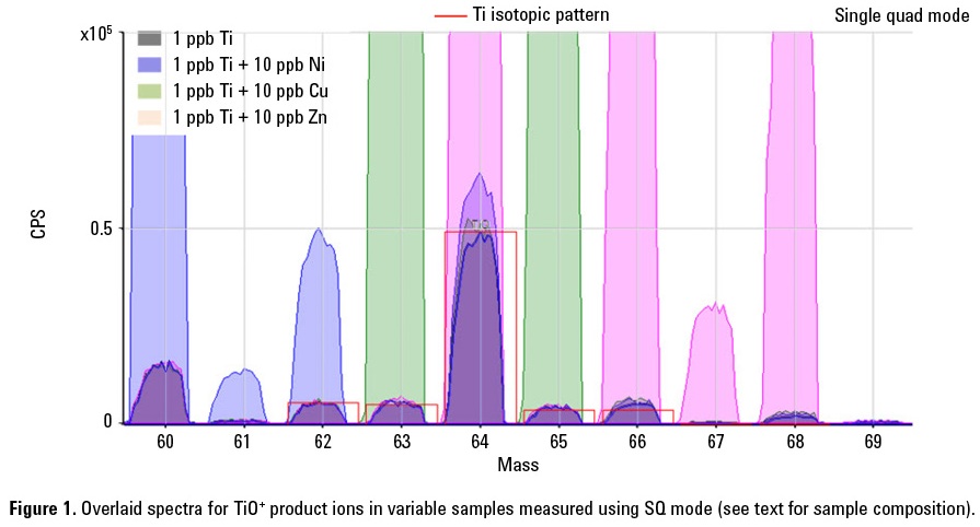 The native ion overlaps that could affect the measurement of TiO+ product ions with oxygen reaction gas are shown in Table 1. It should be noted that these native ion overlaps cannot be rejected by the cell bandpass settings of a conventional quadrupole ICP-MS, because they occur at the same mass as the analyte product ion being measured.