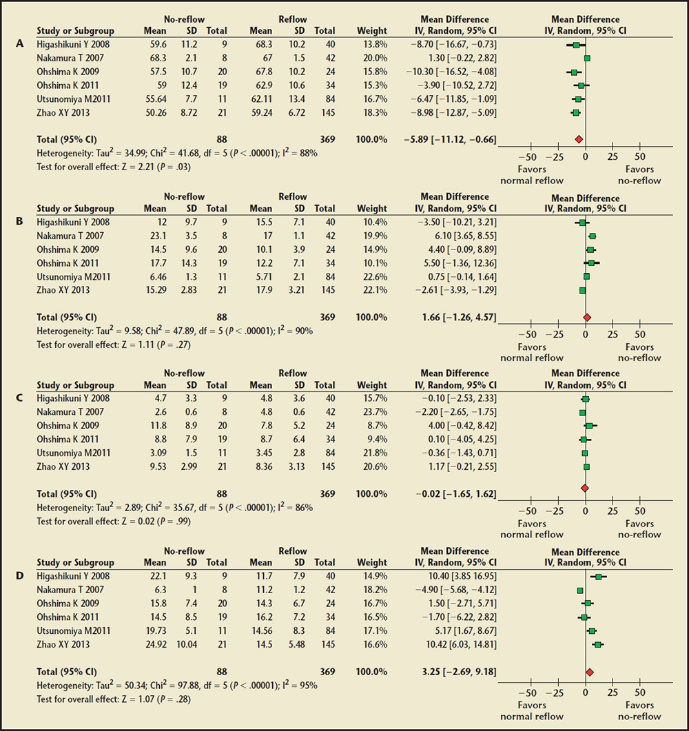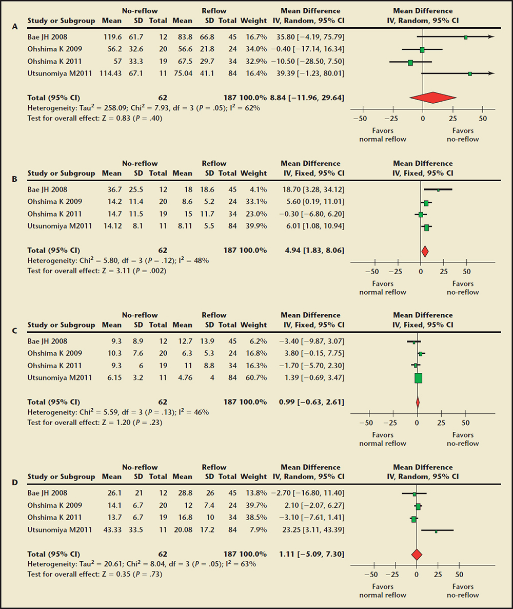 There are limitations to the present study. First, 14 studies included in our meta-analysis were observational studies. The potential effects of selection bias and confounding must be considered when interpreting their results. Second, some heterogeneity was observed among the included studies, which was due primarily to the design of the included trials (most were not randomized controlled trials), IVUS measurements were not usually reported uniformly in the individual studies, and the patient characteristics. Third, not all studies included in our review reported complete IVUS data concerning the no-reflow phenomenon.