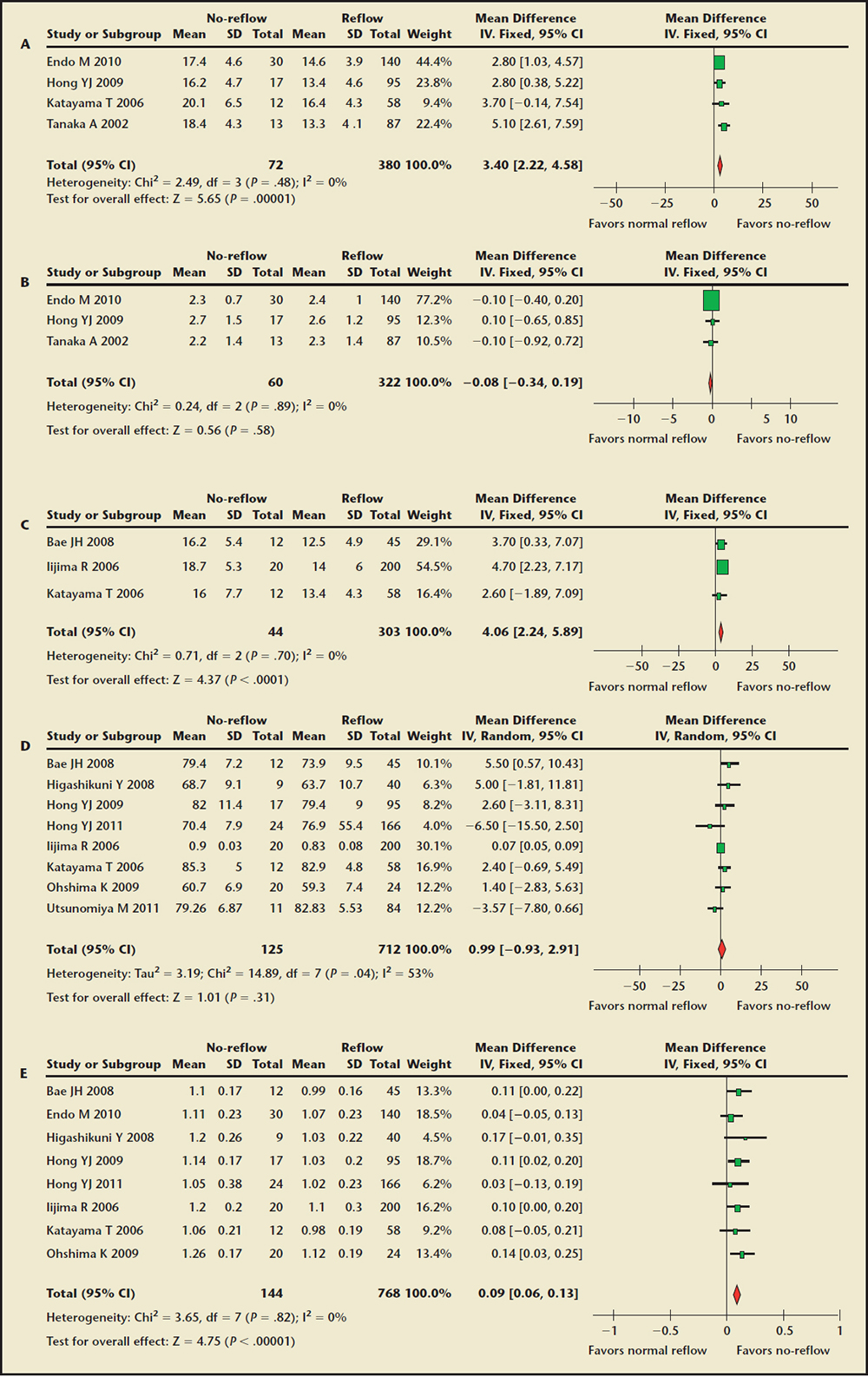 Figure 4. Forest plot of weighted mean difference for the entire culprit lesion analysis in the no-reflow and normal reflow groups. (A) External elastic membrane crosssectional area comparison. (B) Lumen cross-sectional area comparison. (C) Plaque area comparison. (D) Plaque burden comparison. (E) Coronary artery remodeling index comparison. CI, confidence interval; IV, instrumental variable; SD, standard deviation.