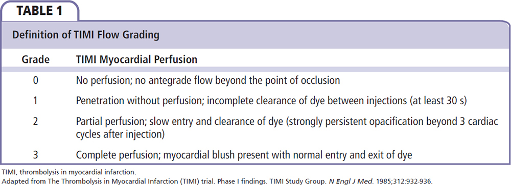The “no-reflow” phenomenon refers to the inability to reperfuse myocardial tissue despite the reopening of the infarct-related artery.1 No-reflow often happens in acute myocardial infarction (MI) patients during primary percutaneous coronary intervention (PCI), which has a strong negative impact on clinical outcome, negating the potential benefit of primary PCI. No-reflow is associated with a higher rate of mortality and early postinfarction complications.2 The occurrence of no-reflow can be evaluated first in the catheterization laboratory by the use of angiographic indexes, Doppler wire, and electrocardiographic assessment.3 On angiograms, the no-reflow phenomenon is defined as substantial coronary antegrade flow reduction (less than thrombolysis in MI flow grade 3) without mechanical obstruction (Table 1).4,5