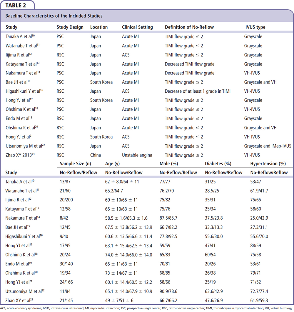 The purpose of this pooled analysis is to combine primary data from all relevant studies to produce reliable estimates of the associations of coronary plaque composition assessed by IVUS with the incidence of no-reflow after PCI among patients with acute coronary syndrome (ACS).