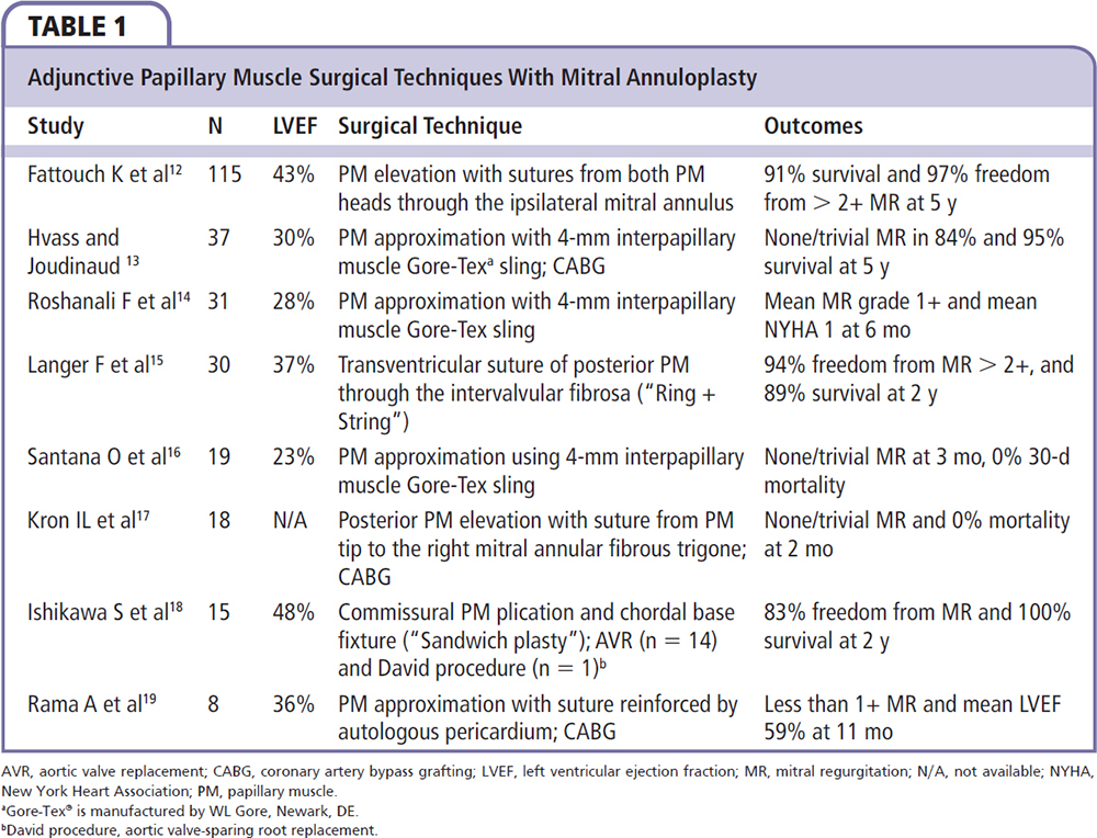 - Roshanali F, Vedadian A, Shoar S, et al. Efficacy of papillary muscle approximation in preventing functional mitral regurgitation recurrence in high-risk patients with ischaemic cardiomyopathy and mitral regurgitation. Acta Cardiol. 2013;68:271-278.