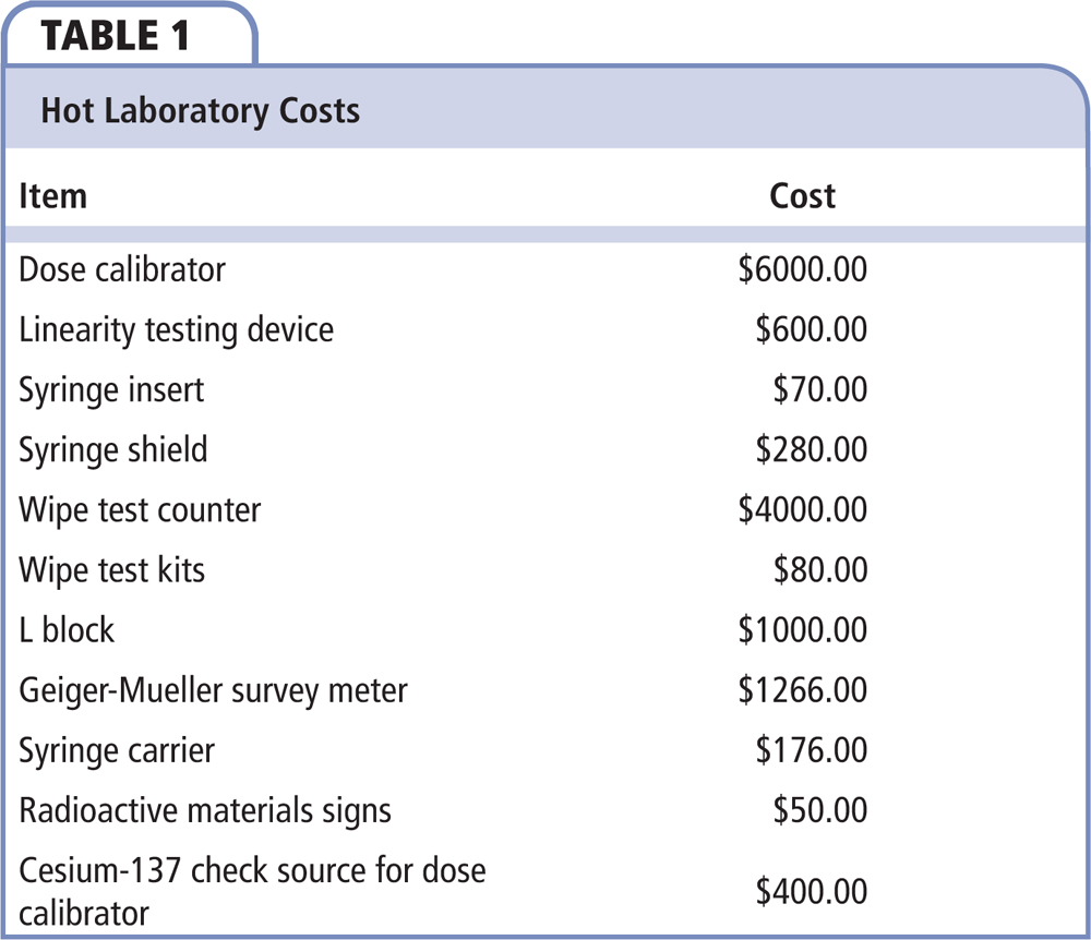 The essential items for a hot laboratory, along with approximate costs, are provided in Table 1. Used equipment can be purchased to reduce cost. The cost of design and construction of the hot laboratory varies, and is not included in Table 1. A Geiger-Mueller–style survey meter is required to detect any spilled or leaked radioactive material. It may also be used to survey patients prior to their release to the public. Wipe test kits are useful in investigating any suspected spills in the hot laboratory, and are necessary for the periodic leakage testing of the cesium-137 source, which is used for daily constancy checks on the facility’s dose calibrator. Syringe shields may not be necessary per institutional protocol.