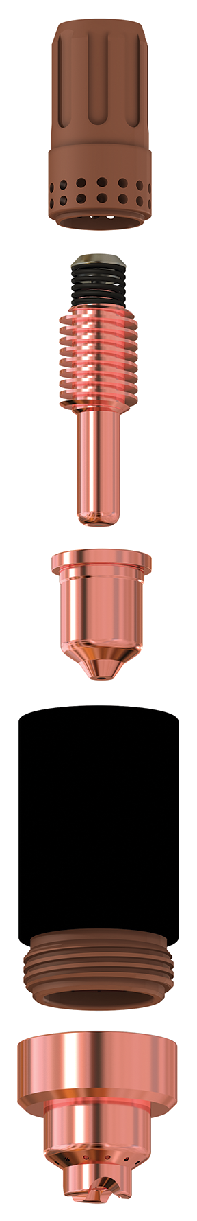These components make up some of the consumables in a plasma cutting system's torch..