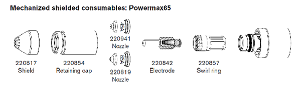 The above illustration shows the components or consumables as used in the latest technology air-plasma torches. These parts are used in a Hypertherm Powermax65 for mechanized cutting. All of these parts are called consumables, because they are easily (no tools) replaceable parts in the torch. But in reality, only the nozzle and the electrode are the most commonly replaced components.
