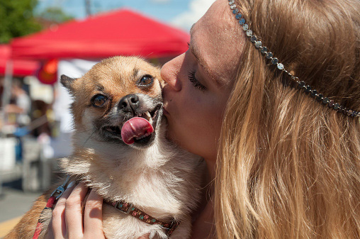 A woman’s furry friend accompanies her at Midwood Maynia, Plaza Midwood's festive event that welcomes warmer weather and spring blossoms.