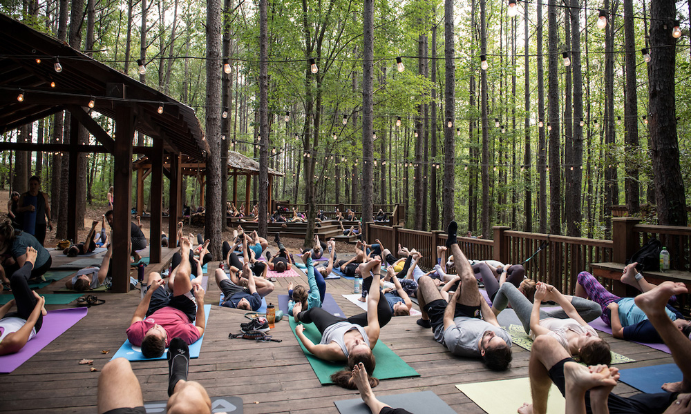 A large group enjoys morning yoga at the U.S. National Whitewater Center where a variety of fitness programs and wellness workshops are available.