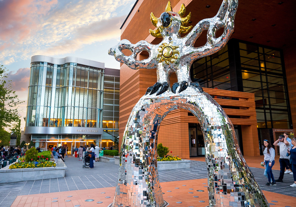 A glistening 17-foot-5-inch-tall whimsical sculpture greets visitors at the Bechtler Museum of Modern Art.