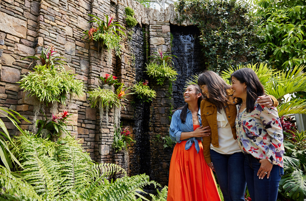 A group of friends explore the gardens of the Orchid Conservatory, an 8,000-square-foot, five-story glass house dedicated to orchids and tropical plants.