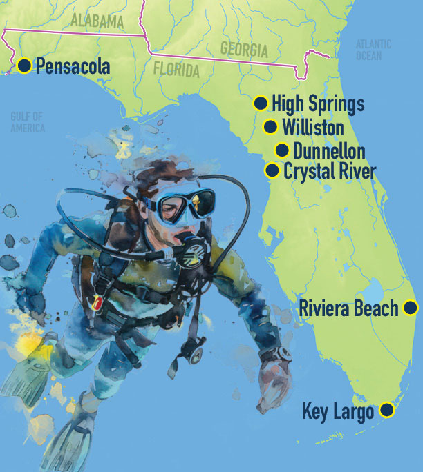 Take the plunge on a Florida road trip that explores the Sunshine State’s most unforgettable scuba diving sites—from crystal-clear springs to sunken ships.