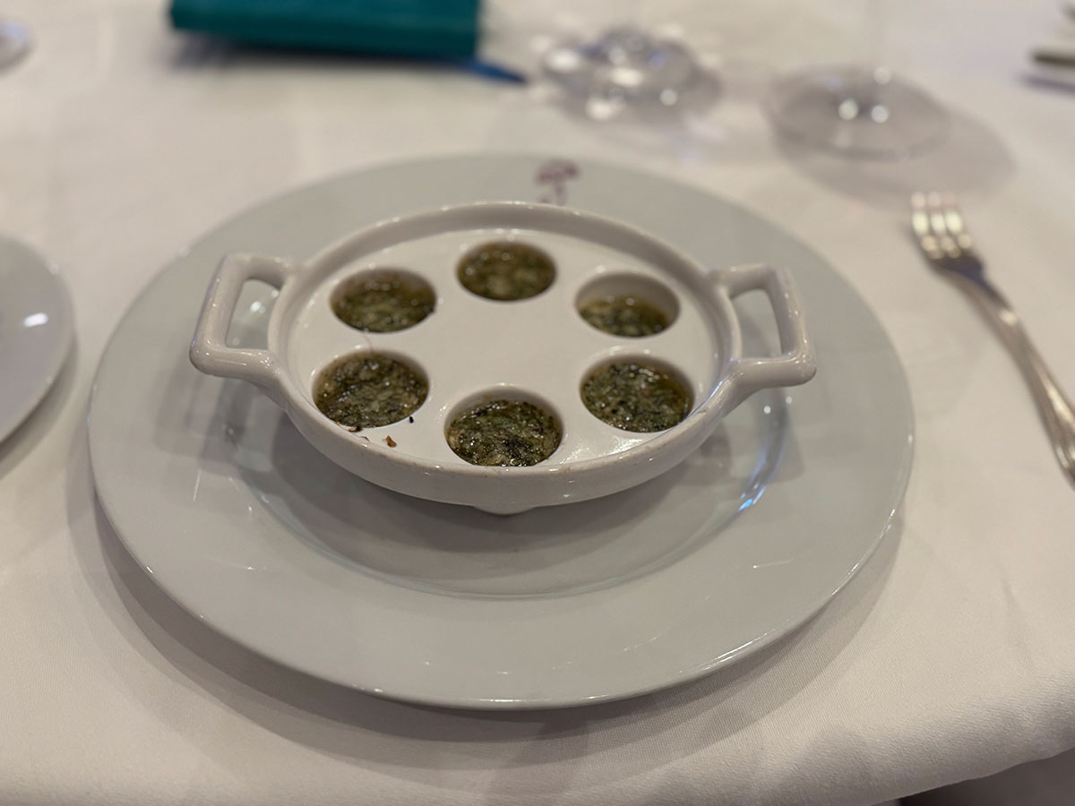 Our meal at Jacques was one of my best in recent memory. The venue is the first restaurant at sea by legendary Master Chef Jacques Pépin. The menu showcases classic French bistro dishes with a charming, rustic touch. I ordered the Escargots à la Bourguignonne and the Homard Thermidor à ma Façon (Maine Lobster Baked in Shell with Mushroom Cream Sauce, Served with Crispy Parmesan). Every morsel was a chef’s kiss.