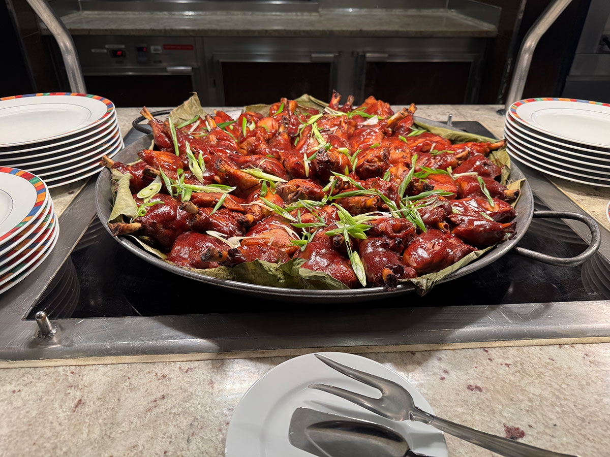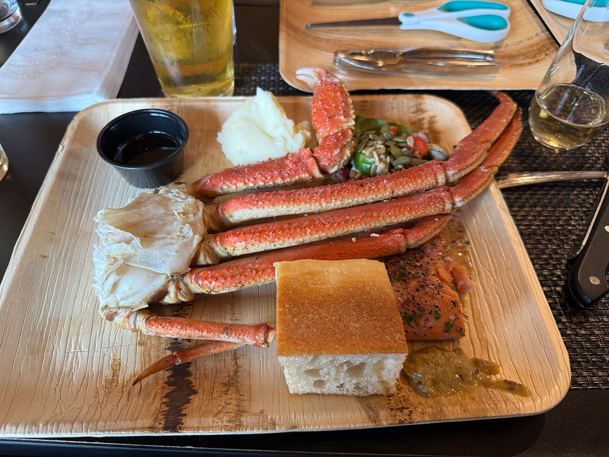 One evening during our cruise, Terrace Cafe hosted the Alaska Chef’s Market Dinner, which was curated by the onboard culinary team using fresh, local ingredients from the region. It was spectacular. We savored ceviche station, local smoked fish, various salads, fish chowder salmon cakes, local king salmon, shrimp pasta, and a bevy of other delicious dishes.