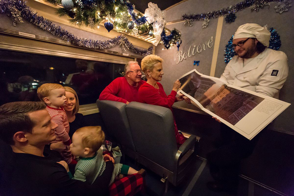 A family listening to the reading of “The Polar Express” aboard a train at the North Carolina Transportation Museum.