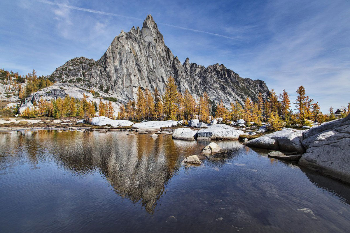 The Enchantments—a tucked-away kingdom of crystalline alpine lakes, meadows of grass and heather, bright-yellow larches among deep-green firs, intrepid mountain goats and soaring granite crags in Washington’s Cascade Mountain Range—is a rare reward reserved for experienced hikers and backpackers. Once the domain of the Yakima, Wenatchi and Chinook peoples, the beguiling area received its present name from 19th-century topographer Albert Hale Sylvester. Dauntless mountaineers made their way to The Enchantments in the 1940s, bestowing names from Norse mythology on many of the natural landmarks, resulting in Gnome Tarn, Lake Freya (officially Tranquil Lake) and Valhalla Cirque. The Enchantments’ network of trails is generally steep and challenging, and affords dazzling views of places like the aptly named Perfection Lake with its mirror-like waters and tiny island beneath the Little Annapurna mountain peak. Today, access to The Enchantments, located about 15 miles southwest of the popular Bavarian-themed town of Leavenworth, is managed by the U.S. Forest Service, which offers free permits for day use and paid permits for overnight use from May 15 to Oct. 31 at recreation.gov.