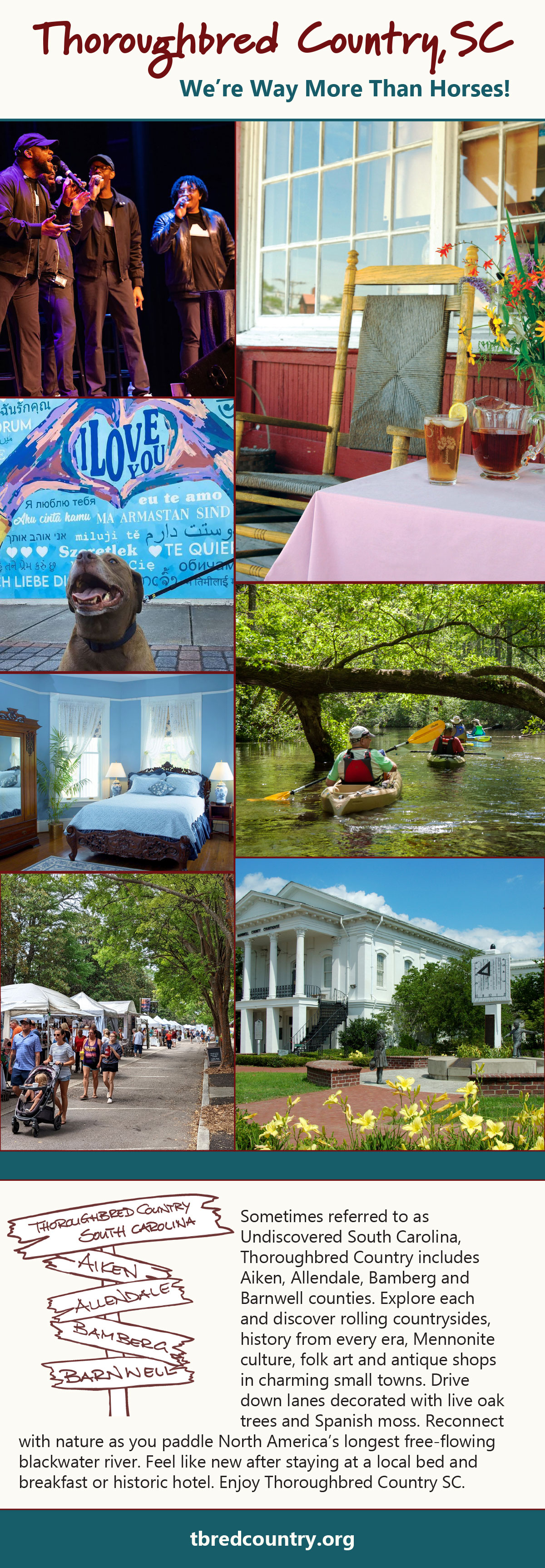 Take a detour off the interstate and enjoy a getaway in Thoroughbred Country, South Carolina. Here you might find a sense of adventure, peace with nature and a new appreciation for all things equine.