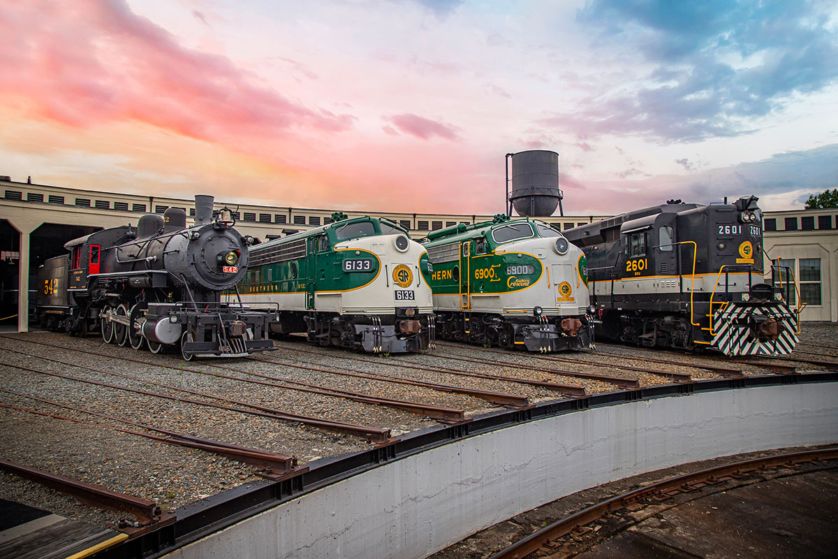 Engines on display at North Carolina Transportation Museum’s roundhouse