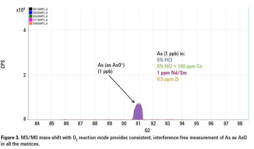 Figure 3 shows that the 8800 ICP-QQQ in MS/MS mode with O2 reaction gas provides reliable and consistent measurement of As (as AsO+) in all matrices. All the original polyatomic and doubly-charged interferences at m/z 75 are avoided by mass-shifting the As to m/z 91; and in MS/MS mode the 91Zr+ ion is removed by Q1, so the potential overlap on the AsO+ production at m/z 91 is also removed.