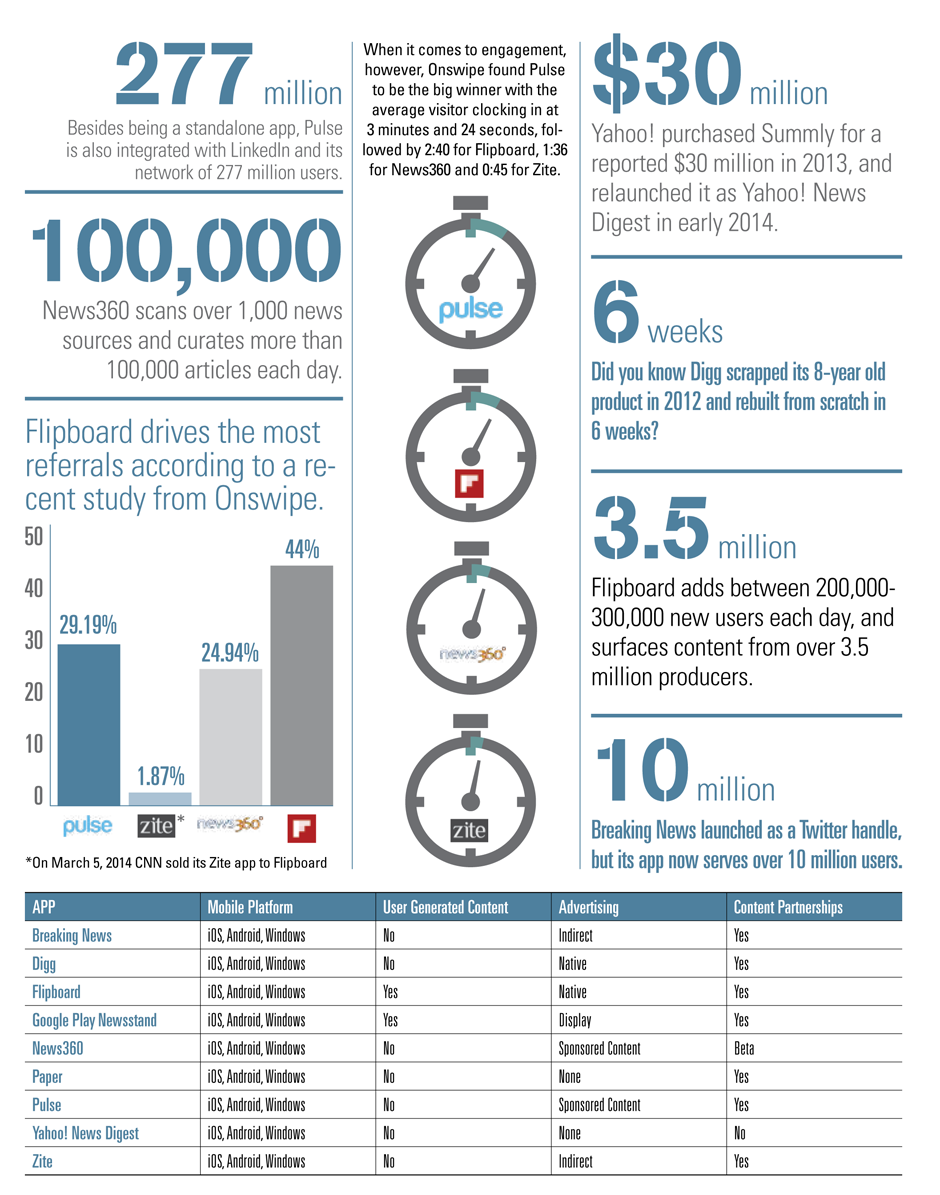 Another issue for both readers and publishers is the sheer number of options. What’s the difference between, say, Pulse and Paper? Is there a benefit for using or having content on more than one app? How is the content discovered and surfaced from one app to another? The list of questions goes on and on, and while the aggregators all have the same objective, they are not all created equally. With that in mind, here is an infographic that maps some important features and performance metrics on some of the most popular aggregators: