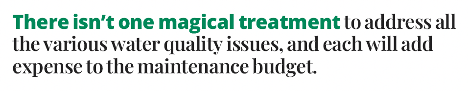 The challenge for the superintendent is to conduct a cost-benefit analysis. It is often di icult to put a dollar figure on improved conditions. Therefore, many superintendents will hire outside consultants to conduct an irrigation system audit within the entire facility to help them identify the problem areas and find potential solutions. It then becomes one more added expense due to poor water quality.