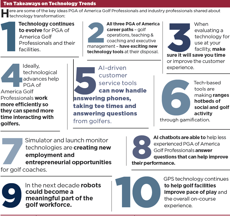 PGA of America Golf Professionals often find themselves divided between two worlds: One of rewarding in-person interactions with golfers, and another of retreating to an office to complete tedious tasks. Thanks to technology trends rippling throughout the business world today, it is quickly becoming possible for golf professionals to shift the balance significantly in favor of spending more time on the course, in the golf shop or walking the range talking and building relationships with golfers while some of the busy work of running a business is handled by artificial intelligence (AI) agents and other technology tools.