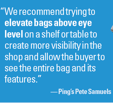 Finally, if you carry bag lines from club brands, try merchandising a bag with a set of that brand’s clubs. Samuels says Ping’s G Le3 ladies’ line includes both a cart and carry bag that match the product colors.