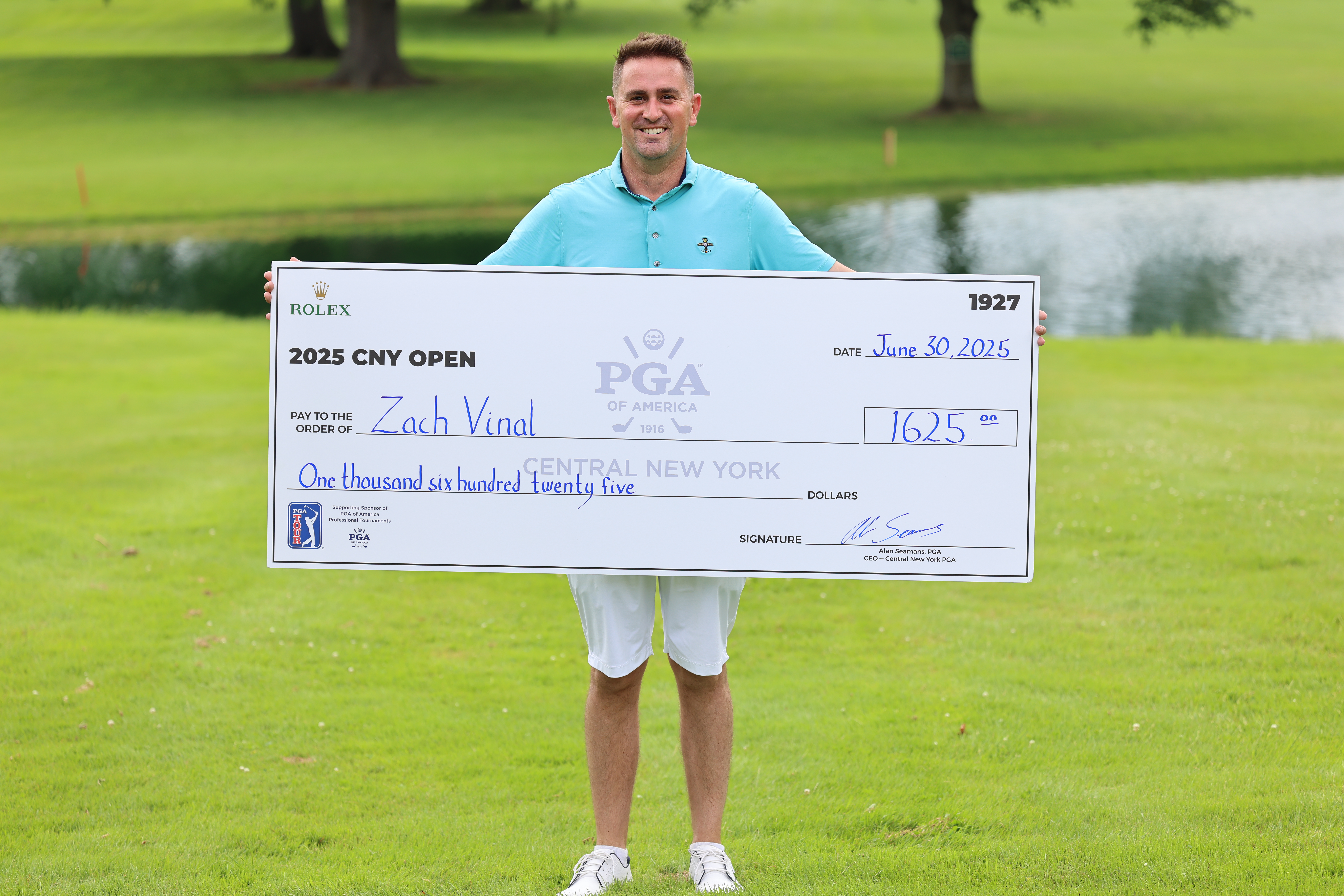 The competitive side of PGA of America Associate Zach Vinal came out at the right time during the Central New York Open. Despite not playing much golf over the past 12 months, Vinal’s confidence in his game helped him fire rounds of 67 and 69 to win his first major as a Professional June 30 at Cortland Country Club. “It just felt like the right things came together at the right time,” Vinal said. “I found something in my golf swing on Friday that I knew if I trusted it for this event, I could play like I know how. So, this was nice to win in such a big event.” Vinal, the Director of Golf at Yahnundasis Golf Club, finished his 36 holes at 8-under-par 136 overall, three strokes better than Ryan McGinnis, PGA (Turning Stone Resort Casino) and Tim Hume, PGA (McConnellsville GC). Vinal, a Syracuse native, returned to Central New York two years ago after working in the golf industry for five years while living in Florida. As an amateur, the CNY PGA Junior Tour alum regularly competed in the AIM Championship (formerly the Post-Standard Amateur) and most recently played in the U.S. Open Qualifier in May. “I love to compete,” Vinal said. “I love the pressure and love to win so not much has changed in that department for me. I will always play in events just to really understand what I need to work on in my game.” -Fran Piraino |