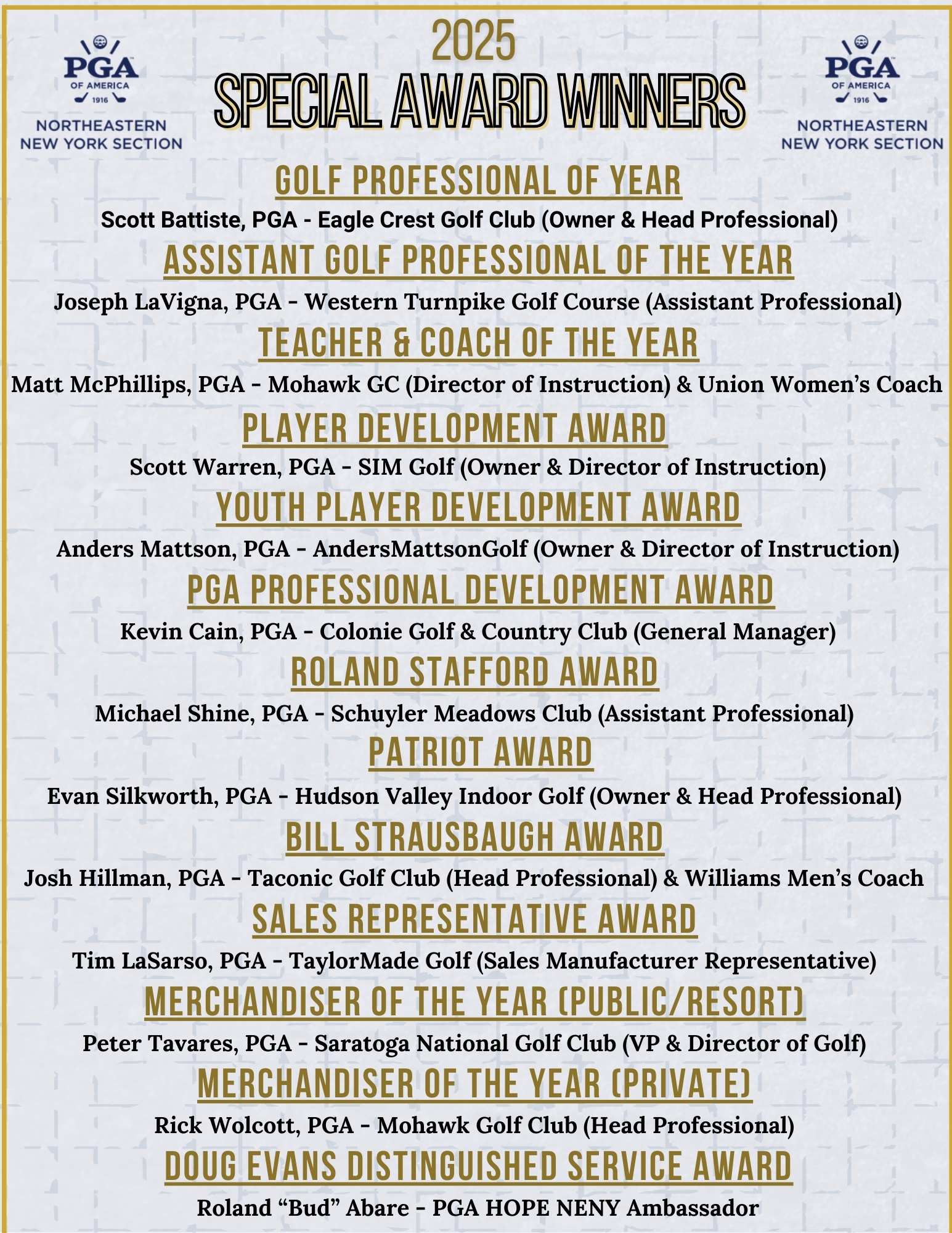 The Northeastern New York Section of the PGA of America is proud to announce the Class of 2025 Special Award Winners. All 2025 NENY PGA Special Award Winners will be celebrated for their achievements in the fall at an event combined with our NENY PGA Section Fall Membership Meeting.