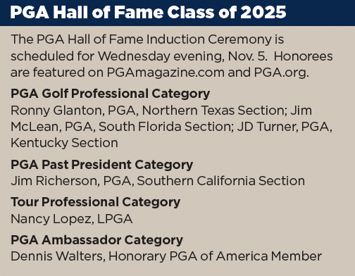 The PGA of America National Awards will honor the 12 individuals to earn 2025 awards, headlined by PGA of America Golf Professional of the Year Scott Paris of Plainfield Country Club in Edison, New Jersey, as well as the Northern Texas PGA Section – winner of the Herb Graffis Award. The PGA Hall of Fame Ceremony will see the induction of six new members: PGA Past President Jim Richerson, PGA of America Members Ronny Glanton, Jim McLean and JD Turner, LPGA legend Nancy Lopez and trick-shot artist Dennis Walters.