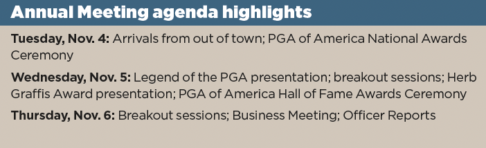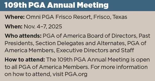 PGA of America Members can see the full agenda for the 109th PGA Annual Meeting on PGA.org, and can log on to a livestream of the event through the site on Nov. 5-6. —Don Jozwiak