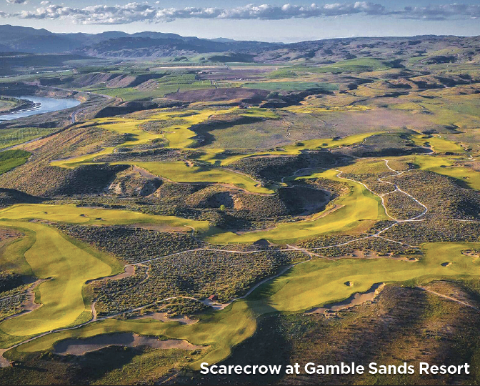 Gamble Sands Resort in Brewster opened Scarecrow, its second 18-hole layout, on 300 acres of rumpled and rolling terrain where cornfields once stood. The David McLay Kidd design overlooks the Columbia River Valley, where the 6,900-yard par-71 course plays firm and fast, and is partly perched on a cliff. The resort also opened 40 new double-king rooms at The Inn at Gamble Sands in June, with an adjacent putting green. The new golf-view rooms overlook Scarecrow. There are now 77 luxury rooms overall. Gamble Sands also debuted a new onsite shuttle service to help guests get to and from The Inn, the clubhouse/F&B complex, the golf courses and the Cascades Putting Course.