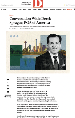 PGA of America CEO Derek Sprague recently sat down for an interview with Dallas’ D Magazine to look back on the first eight months of his tenure. The longtime PGA of America Golf Professional covered a number of topics in the piece, including the state of the ongoing golf boom, his focus on employment for PGA Members and the close partnership between the Association and the city of Frisco. “People don’t always see sports as an economic driver, but certainly your county treasurers and your state treasurers do,” said Sprague. “They see that when you bring thousands and millions of people over a year’s period, no matter what sport, it’s a huge economic driver.” He also revealed that he likes to listen to golf podcasts and Billy Joel music on his commute to and from the office.