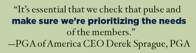 Derek Sprague: It’s important to have the pulse of our membership. It’s a large membership, and we want to know what they like, what areas they think need to be improved. The Association belongs to its members, and membership is optional. It’s essential that we check that pulse and make sure we’re prioritizing the needs of the members, whether that’s employment or education, or programs like PGA Jr. League that help them and their facilities grow the game and their business.