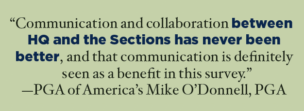 O’Donnell: The Sections and EDs are a significant part of increasing the engagement of members in this survey. The record high response is due in large part to the collaboration between national and the Sections in making sure the awareness of this survey’s importance was understood. With Don Rea Jr. as PGA President of America, he’s prioritized having a Section Executive Director’s presence on all the national committees and working through the SBO. That communication and collaboration between HQ and the Sections has never been better, and that communication is definitely seen as a benefit in this survey.
