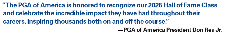 “The PGA of America is honored to recognize our 2025 Hall of Fame Class and celebrate the incredible impact they have had throughout their careers, inspiring thousands both on and off the course,” says PGA of America President and Master Professional Don Rea Jr., PGA Owner/Operator of Augusta Ranch Golf Club in Mesa, Arizona. “Whether they have won major championships, given thousands of lessons or captivated audiences with trick shots, each PGA Hall of Fame Member has played an essential role in shaping the game of golf as we know it today.”