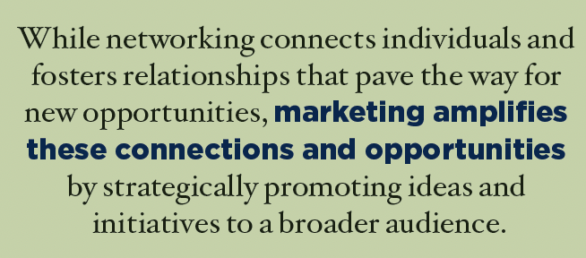 While networking connects individuals and fosters relationships that pave the way for new opportunities, marketing amplifies these connections and opportunities by strategically promoting ideas and initiatives to a broader audience. When we inter twine networking and marketing, we can enhance brand awareness, foster word of mouth promotions, conduct market research and assess our value proposition.