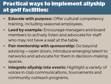 Golf facilities – whether public, private or resort – can make allyship a cornerstone of workplace culture by embedding it into policies, training and daily interactions. The goal is to ensure that every team member feels seen, supported and empowered to succeed.