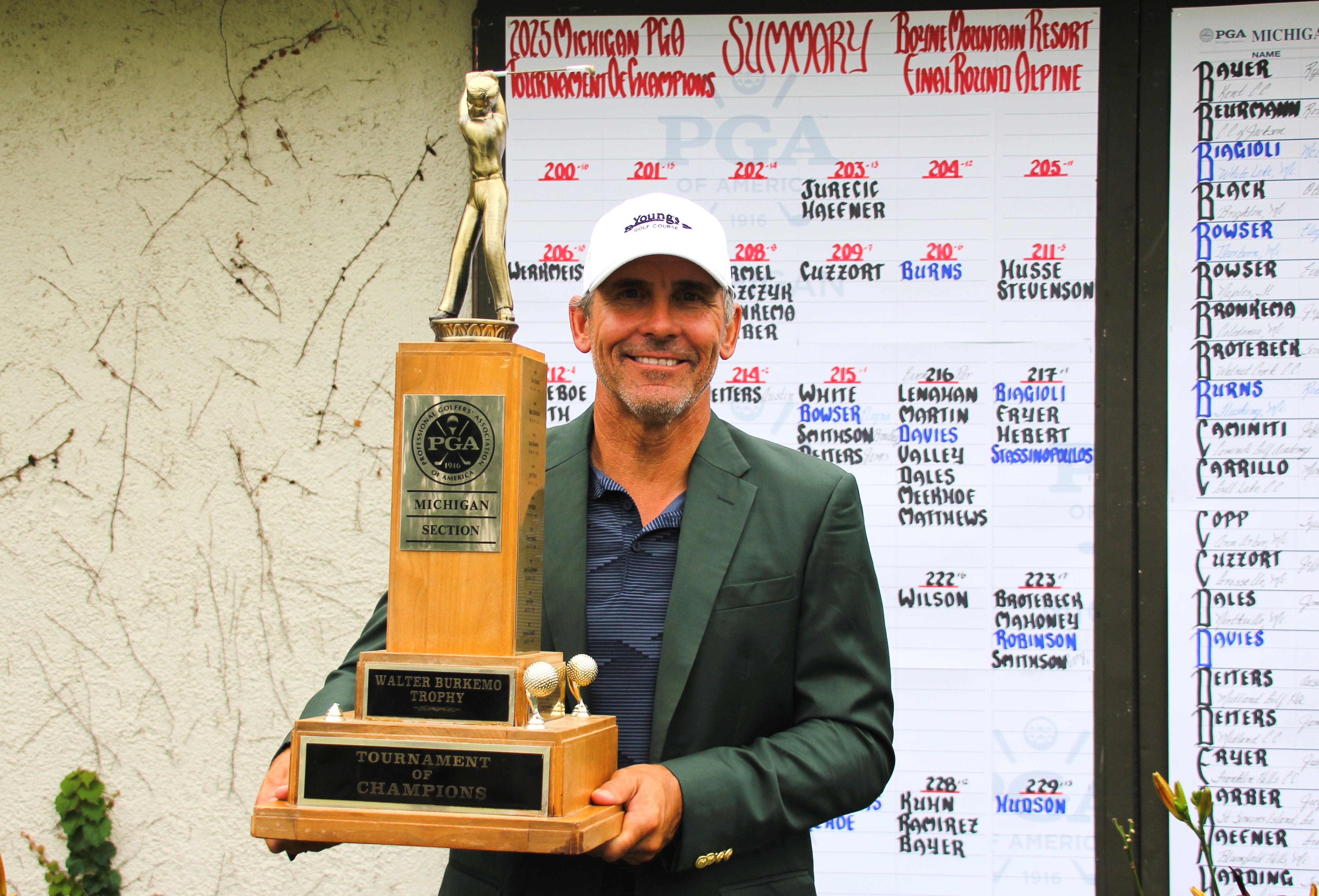 Crystal Falls’ Jay Jurecic Pulls Off a Miracle Finish to Win the Tournament of Champions Trailing by two shots on the par-5 No. 18 of the Alpine Course at Boyne Mountain Resort, Jurecic, 55, launched a 260-yard 3-wood that hit the flagstick and stopped a foot away. The tap-in eagle forced a playoff with Grant Haefner of Bloomfield Hills. In sudden death, Jurecic sealed the win with a 45-yard pitch to five inches for birdie. His final-round 67 gave him a 13-under 203 total and the Walter Burkemo Trophy, green blazer, and $10,500 first prize. “I wasn’t banking on hitting the flag, but that was my hope—the miracle finish,” Jurecic said. “At 55, I think I’m playing the best golf of my life.” Haefner, a 27-year-old mini tour player, also closed with 67 but settled for runner-up. Michigan Golf Hall of Famer Tom Werkmeister finished third with 206, while past champions Otto Black and Jack Kneen were among a group tied at 207. The unique championship features men, women, professionals, amateurs, seniors and juniors competing for the same title. “It gives everybody a chance on a great golf course,” Jurecic said. “This is special. Glory to God.” Thank you to Boyne Mountain Resort for being a longtime host site and supporter of this event. •••••• Baker Stevenson Claims Michigan Assistants Championship TitleAfter finishing runner-up a year ago, Baker Stevenson of Meadowbrook Country Club captured the 2025 Michigan Section Assistants Championship at Travis Pointe Country Club. A field of 46 Michigan PGA Section Assistants teed it up, competing not only for the Section title but also for four coveted spots in the National Assistant PGA Professional Championship, set for November 13–16 at PGA Golf Club in Port St. Lucie, Florida. Stevenson opened with an even-par 72, trailing first-round leader Wyatt Vogel of Prestwick Village Golf Club by three strokes. However, the back nine of the final round belonged to Stevenson, who carded birdies on No. 10, 11, 13, and 14 to close out with a 32 for a round of 67. His total gave him a four-shot victory over Michael Carrillo of Gull Lake Country Club, Sean Vann of Country Club of Jackson, and Brandon Petzak of Eagle Crest Golf Club. Because Stevenson and Petzak remain Level 1 Associates, they are ineligible to advance to the National Championship –opening the door for Matthew Leti of Country Club of Detroit, who finished at 1-over-par to secure the third qualifying spot alongside Carrillo and Vann. The final qualifying spot was determined by a five-hole playoff between Justin McPhail of Traverse City Golf & Country Club, and Parker Fanning of Oakland Hills Country Club. Fanning claimed the last qualifying position, while McPhail will serve as first alternate. The Michigan PGA extends its sincere thanks to Travis Pointe Country Club for its exceptional hospitality and to presenting sponsors: Srixon, Cleveland Golf, and the PGA TOUR for their continued support of this championship. •••••• Tom Werkmeister Wins His Third Michigan Senior Open Title Tom Werkmeister, 57, Michigan Golf Hall of Famer, of Hudsonville, MI successfully defended his title and earned his third Michigan Senior Open win at Bedford Valley Golf Club. Werkmeister closed with a 73 following his opening-round 65 for a 138 total, but it wasn’t enough to avoid a playoff. Doug Hoey of West Olive, MI came in with a birdie on No. 15 and an eagle on No. 16 to shoot 70 and force a sudden-death playoff. Back on the 18th, Hoey’s wedge approach landed 12 feet away, while Werkmeister’s wedge approach hit the flagstick and stopped a couple of feet inside Hoey’s. Hoey’s birdie putt just missed, and Werkmeister rolled his in to secure the win and an exemption from the USGA into the sectional round of qualifying for the U.S. Senior Open. This was Werkmeister’s second consecutive win of the Michigan Senior Open, and third since 2019. “Winning again this year is really, really cool, but it was a struggle out there all day,” said Werkmeister, who managed to hold at least a one-shot lead until Hoey’s eagle at 16. “For some reason, I was comfortable in the playoff. I don’t know if it is because I’ve had success in them before, but while I had anxiety early in the round and hit a lot of bad shots, I hit three really good shots in the playoff.” Hoey, a former Michigan Amateur Champion, said he and Werkmeister have competed against each other since junior golf. “I beat him when we were in junior golf, but he has more than made up for it since,” Hoey said and laughed. “We have a great time when we play together. We seem to bring out the best in each other.” Frank McAullife of Meadowbrook Country Club finished third at 140, while a fivesome tied at 141–Scott Hebert of Traverse City Golf & Country Club, who shot 69; amateur Greg Davies of West Bloomfield, who shot 70; Andy Walker, the head golf coach at Eastern Michigan University, who shot 71; James Dieters of Midland Country Club, who shot 71; and Jay Jurecic of Crystal Falls, who shot 73. Tim Matthews of Scotts, 65, played for the first time in the Super Senior Division, shooting a 70 for a (-5) 139 total, winning the over-65 set. Defending champion Greg Zeller of Jackson was runner-up at 141. We would like to thank our host site, Bedford Valley Golf Club, and title sponsor, Yamaha Golf Cars, for their continued support of the Michigan Senior Open. •••••• Jim Deiters Wins the Michigan Senior PGA ChampionshipJim Deiters and 46 other Michigan Senior PGA Professionals were back at Hidden River Golf & Casting Club for the Michigan Senior PGA Championship. Deiters of Midland Country Club captured the title after sinking a birdie on the first playoff hole to defeat Lee Houtteman of Leland Country Club. Both players finished at 2-under for the championship. This marks Jim’s second Michigan Senior PGA title. Deiters and Houtteman claimed two of the eight qualifying spots for the Se