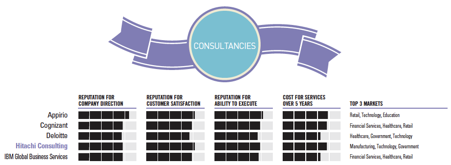 Hitachi Consulting, an industry leader last year, surged ahead of the competition this year on its reputation for customer satisfaction, where it scored a 4.1, and near-the-top scores in the other criteria. The company was also buoyed by its recent acquisition of IMGROUP, a specialist provider of information management and business intelligence solutions. The acquisition increases Hitachi’s European presence and its capability to deliver results for clients in the areas of asset optimization, risk management, and customer experience. “While many of the traditional consultancies have struggled to compete in an increasingly cloud and iterative world, Hitachi has embraced it and continues to differentiate its abilities in the CRM space and in embracing cutting-edge CRM products that drive down the cost and risk of overall projects,” Wettemann says. —Leonard Klie