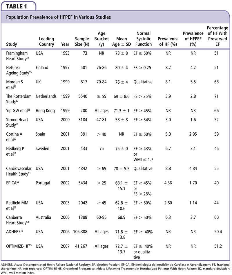 Numerous studies have confirmed that at least half of patients with heart failure have preserved EF, and this segment of the heart failure population consists predominantly of women, the elderly, and people with hypertension and other cardiovascular risk factors (ie, people considered at risk of developing cardiovascular disease).11,13-16 The prevalence of HFPEF within the population varies from 1.14% to 5.5%, depending on age (Figure 1) and other variables, such as diagnostic criteria and methods; when younger age groups are excluded and studies are confined to a population ≥ 65 years, the prevalence rises to between 3.1% and 5.5% (Table 1).