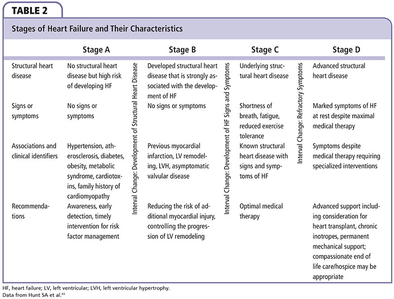 The recent AHA/ACC guidelines43 classify heart failure into four stages based on structural abnormality and damage to the heart muscle (Table 2):