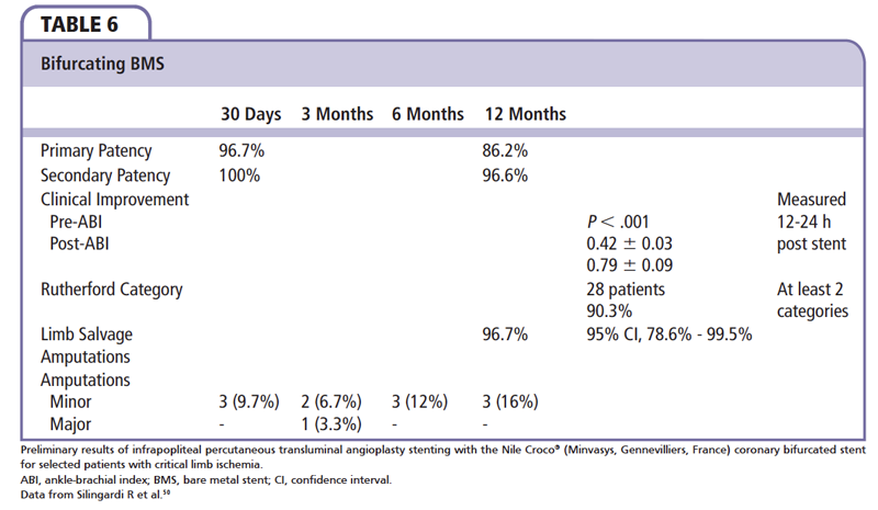 Even with good initial success rates with PTA, restenosis rates from progressive residual stenosis, postdilatation dissections, elastic recoil, and early thrombosis of treated segments for long-term success are low. Further complicating long-term outcomes are complex bifurcating lesions and major side branch lesions that are ignored to achieve patency in the main vessel. Silingardi and colleagues50 examined preliminary results of infrapopliteal PTA stenting with Nile Croco (Minvasys, Gennevilliers, France) coronary bifurcating stents (chromium-cobalt BMS with a short scaffold at the side port to provide coverage of the side branch ostium and allow access to the side branch). The system has two independent balloons, one for the main branch and one for the side branch; the main is deployed prior to the side branch. A total of 31 patients with CLI were enrolled (popliteal, n = 17 [54.8%]; distal tibioperoneal trunk, n = 14 [45.2%]) from October 2006 to December 2010. Preliminary data from this study represent high success rates, both early and mid-term patency rates, and clinical improvement and limb salvage in selected patients with complex, bifurcating infrapopliteal lesions (Table 6).