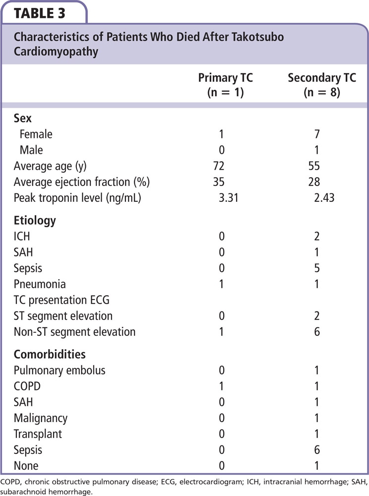 Of the 100 patients, 91 patients survived hospitalization and remained alive in 2011 (Figure 2), whereas nine patients had died (8 of 9 had secondary TC). Of those nine patients, one died of a pulmonary embolus, two died of an intracranial hemorrhage, and six died of septic shock (Table 3). All died as inpatients during the index hospitalization when TC occurred. Of the six septic patients, one patient had end-stage renal disease on hemodialysis and had Killip class III heart failure, two had severe chronic obstructive pulmonary disease with pneumonia, one had a concomitant malignancy and was undergoing chemotherapy (causing subsequent neutropenic fever), another received a liver and kidney transplant during the index hospitalization, and one had a massive pulmonary embolism. With regard to presenting ECG, seven of the nine who died had no STE on ECG at the time of TC diagnosis (1 primary and 6 secondary TC), whereas two of nine had STE on ECG at the time of TC diagnosis (both secondary TC). Of the nine patients who died, eight were women. The average age of this group of nine patients was 57.3 years (SD = 20.1, range 23-77 y) in comparison with 68.7 years (SD = 15.3, range 27-91 y) for the remaining 91 patients (P = .04). The average initial EF of the nine patients who died was 28.9%, compared with 34.3% for the patients who survived (P = .26). The mean time from initial hospitalization to death for this group was 30 days; one patient died on the third day after admission, two died on day 11, one died on day 16, one died on day 17, one died on day 23, one died on day 26, and one died on day 27. One of the nine patients died 150 days after the initial event, however, death was due to a prolonged intensive care unit stay associated with discharge difficulties related to social issues and therefore was excluded from the length-of-stay analysis. TC recurrence was not seen in any of our patients at the time of final follow up in 2011.