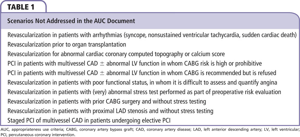 One of the common clinical scenarios not represented in the document is the one in which stress testing was performed but results were either unavailable or unclassifiable. This represents a large number of cases in the National Cardiovascular Data Registry (stress test was not available in the medical record for 50% of unclassifiable cases [8.5% of all PCIs] or the magnitude of ischemic risk was not communicated in 42% of unclassifiable cases [7.2% of all PCIs]).8 Even though the AUC document provides a good definition of the severity of ischemia noted on noninvasive testing, it fails to consider the fact that many cardiologists interpret stress test results without the quantitative assessment required to assign the AUC severity score. Moreover, some patients are unable to tolerate stress testing or have inconclusive stress test results because they cannot achieve the target heart rate. Patients with prior CABG surgery and without stress testing are also not addressed in the document.