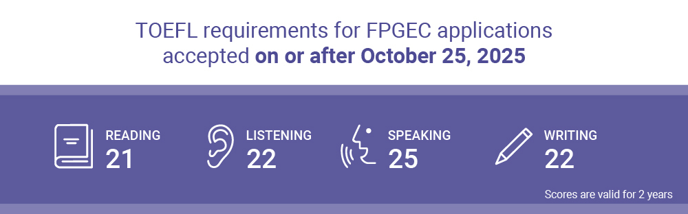 All FPGEC applications that are accepted before September 1, 2025, will require TOEFL iBT section scores that meet the previous passing standards. All FPGEC applications that are accepted on or after October 25, 2025, will require TOEFL iBT section scores that meet the current (revised) passing standards.
